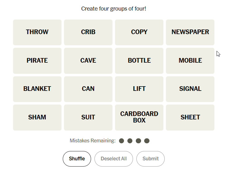 This edition of the Connections puzzle emphasizes verb-related thinking and lateral associations. Some groupings may seem obvious, while others require recognizing deeper patterns that extend beyond the initial meanings. The set of anagrams will likely catch your attention early, whereas the final category rewards those who remember classic childhood games.