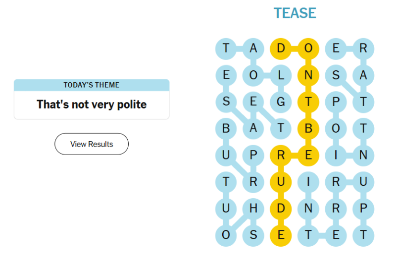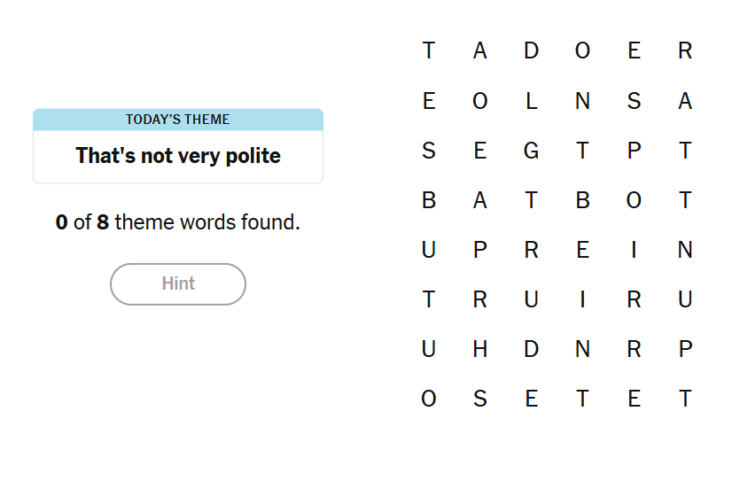 Today’s theme centers around common actions that are widely regarded as rude or disrespectful in social situations. The puzzle favors familiar terms over obscure vocabulary, making it user-friendly. The spangram serves as a lighthearted reminder rather than a literal object, adding a fun element to the grid.